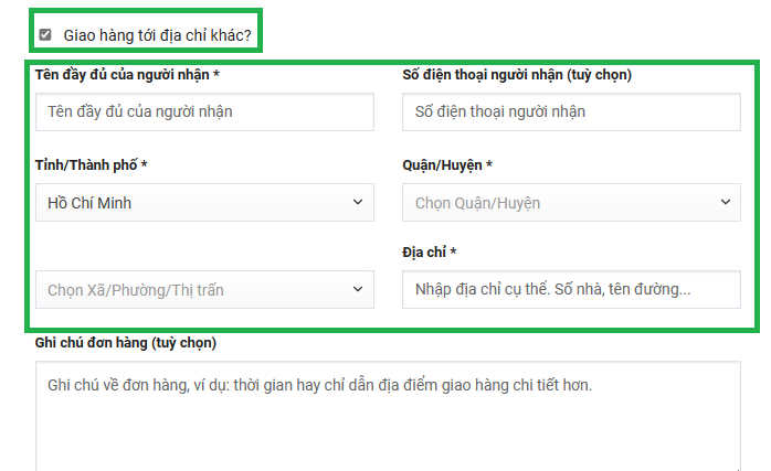 TRƯỜNG HỢP: Địa chỉ đặt hàng và địa chỉ nhận hàng khác nhau. Quý khách click chọn vào Ô “GIAO HÀNG TỚI ĐỊA CHỈ KHÁC?” và nhập địa chỉ giao hàng mới.